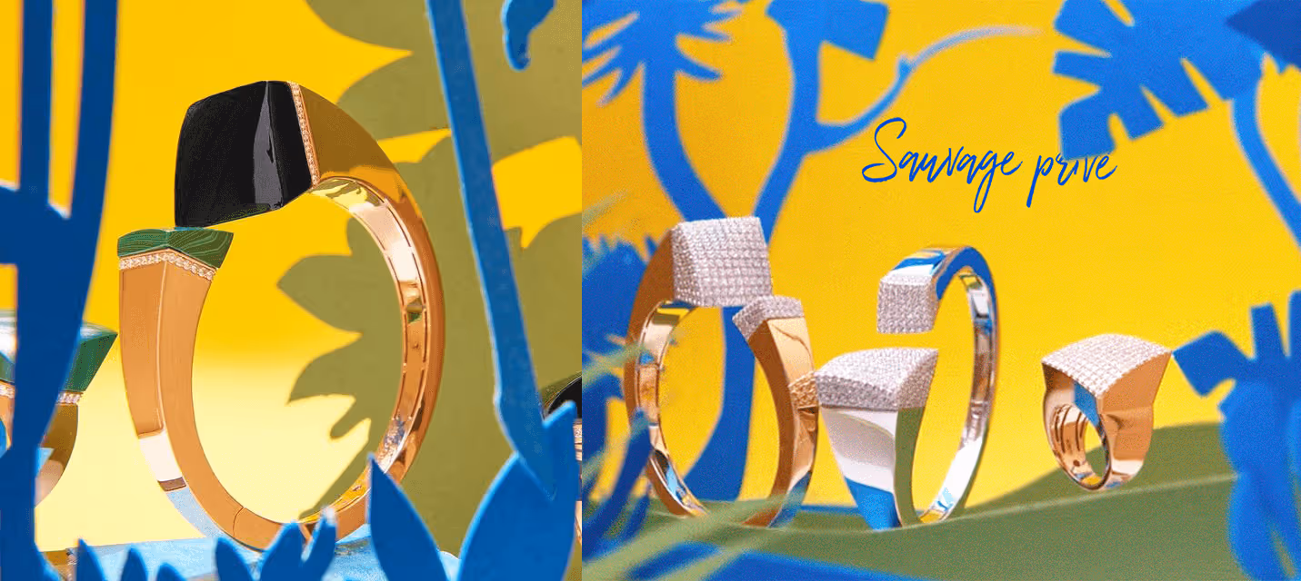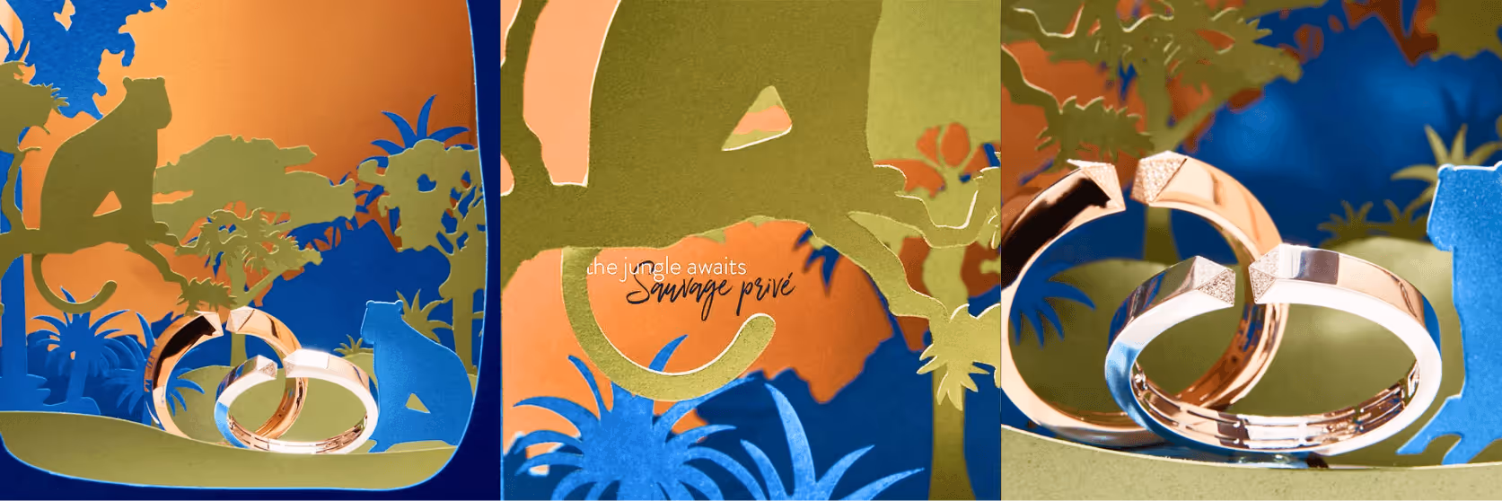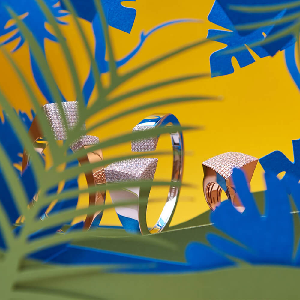 We began with the concept of a stage, placing the jewels in the very spotlight of the performance. Inspired by paper art and 3D shadow boxes, we developed a theatrical setting that became a perfect showcase for the pieces. The vibrant, stylized jungle backdrop enhanced the bold character of the collection, while the play between night and day scenes introduced different moods and atmospheres.