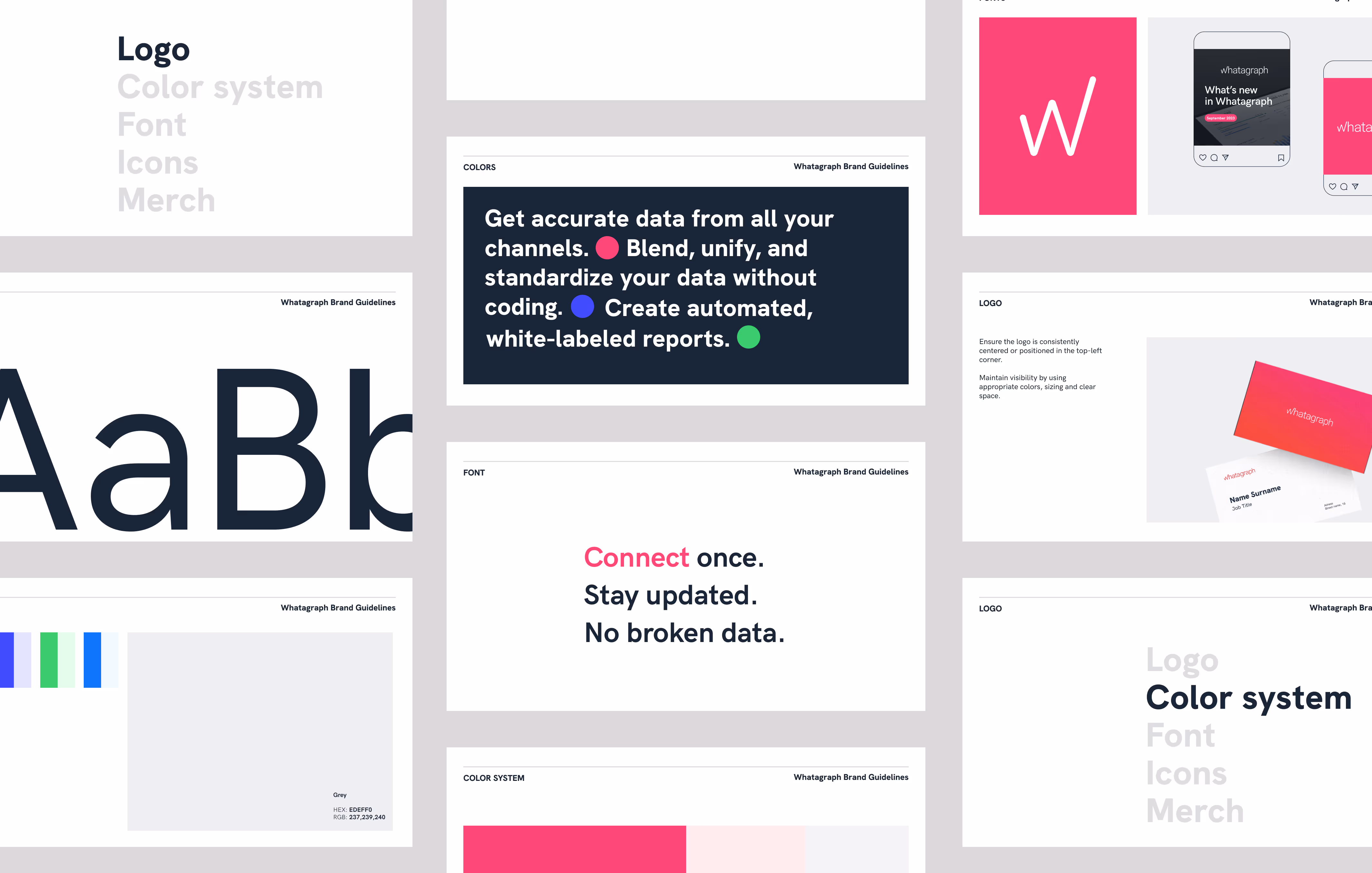When developing the brand book for Whatagraph, my main objective was to build a cohesive visual identity that reflects the brand’s purpose and tone of voice.